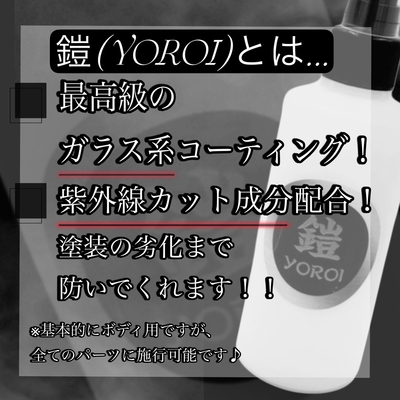 最高級ガラス系コーティング【鎧(yoroi)200ml】マニア向けの特濃仕様!紫外線カット成分入りで塗装焼けも防ぐ♪ 販売価格 4,400円(税込み) 会員価格 (税込み) 通常価格 (税込み) 在庫 商品コード JANコード 数量 - + カートに入れる お気に入りリストへ追加する カテゴリー 車好きがハマる!絆の最強コーティングシリーズ ツイートする シェアする